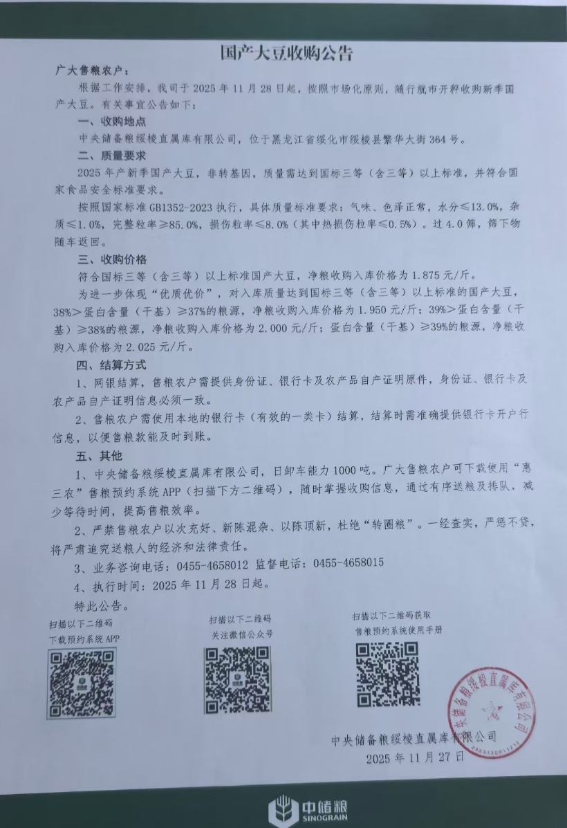 - 2025年新季国储大豆收购价格(持续更新中)2025-11-28